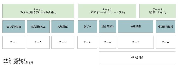 SDGs活動推進のため、メンバーを随時最適化できる「チーム制」を採用しています。チーム制にすることで、コアメンバーだけを固定するなどその時々で、グループ全社を対象に、最適な人材を招集してプロジェクトを推進します。