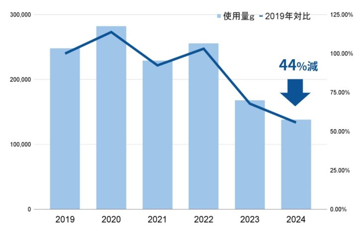2023年には、初めて 32%と目標を達成し、2024年には、44%削減と大きく目標値を超えました。今後も更なる環境負荷低減を目指してまいります。