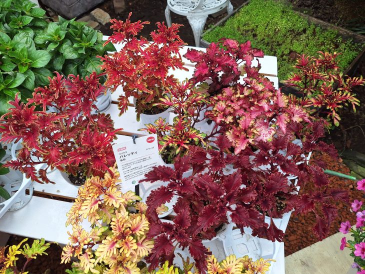 ↑新商品コーナーでは、独特の葉型、葉色が特徴のコリウス バレッティシリーズの新色など展示。