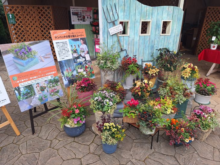 ↑エムアンドビーフローラの商材をふんだんに使った寄せ植えコーナー。寄せ植えで展示・提案することでより植物を楽しんでいただくきっかけづくりとなった。