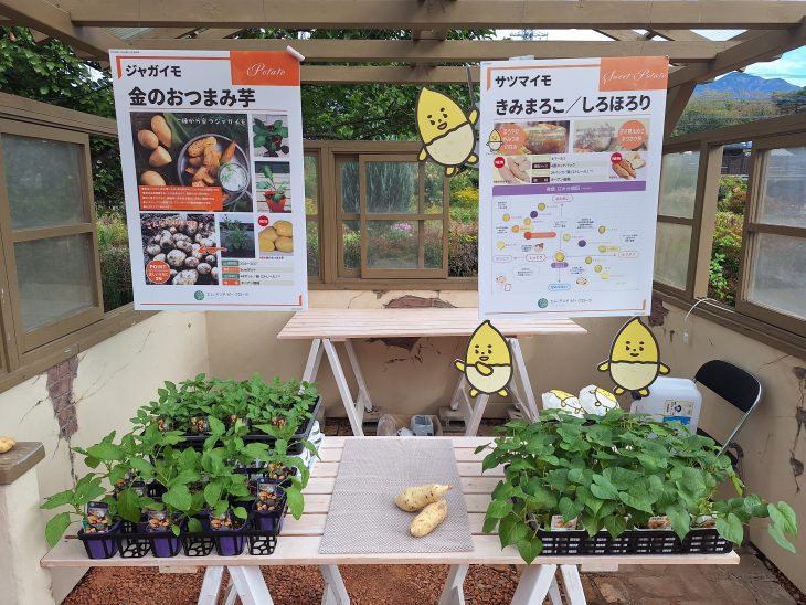 ↑実生系ジャガイモ「金のおつまみ芋」とサツマイモ「きみまろこ/しろほろり」の展示コーナー。期間中は、それぞれの試食も行い、来場者には美味しさも体感していただいた。