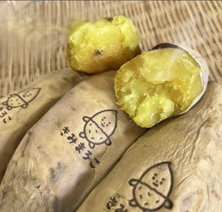 皮が白い上にきみまろこのイメージキャラクター「まろこ」の可愛い焼き印が押された焼き芋が袋に入った状態で登場。その珍しい見た目に、ダイさんも「皮が白くてビックリ!」「袋に入ってるのが好き!」と興奮気味のご様子。
