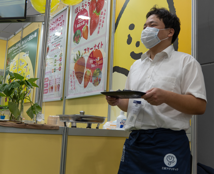 種子から栽培できる、みらいのいちご「ベリーポップはるひ・すず」を展示しました。種子からできるため、衛生管理を徹底している植物工場にもぴったりなベリーポップ。今回の展示会は10月の開催であったため、本来であれば旬とずれて果実の準備が難しいのですが、環境制御し周年収穫が可能な植物工場より果実をご提供いただき、ご来場の方に手に取ってみていただくことができました。