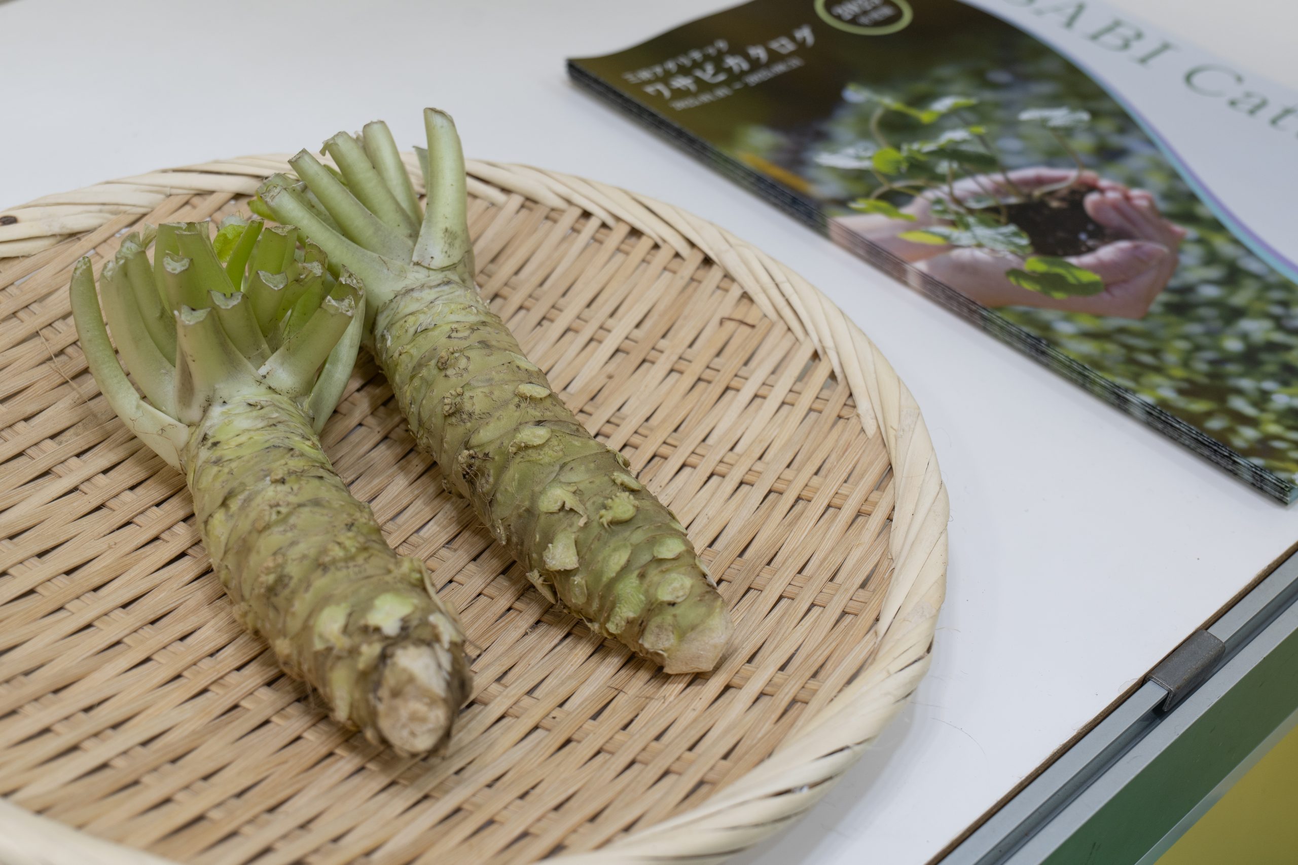 海外でも人気の日本の食材「わさび」。立派なわさび「飛河(ひゅうが)」と培養苗を直接土に植え付けしたプラグ苗を展示。特に海外の方からの注目が集まりました。